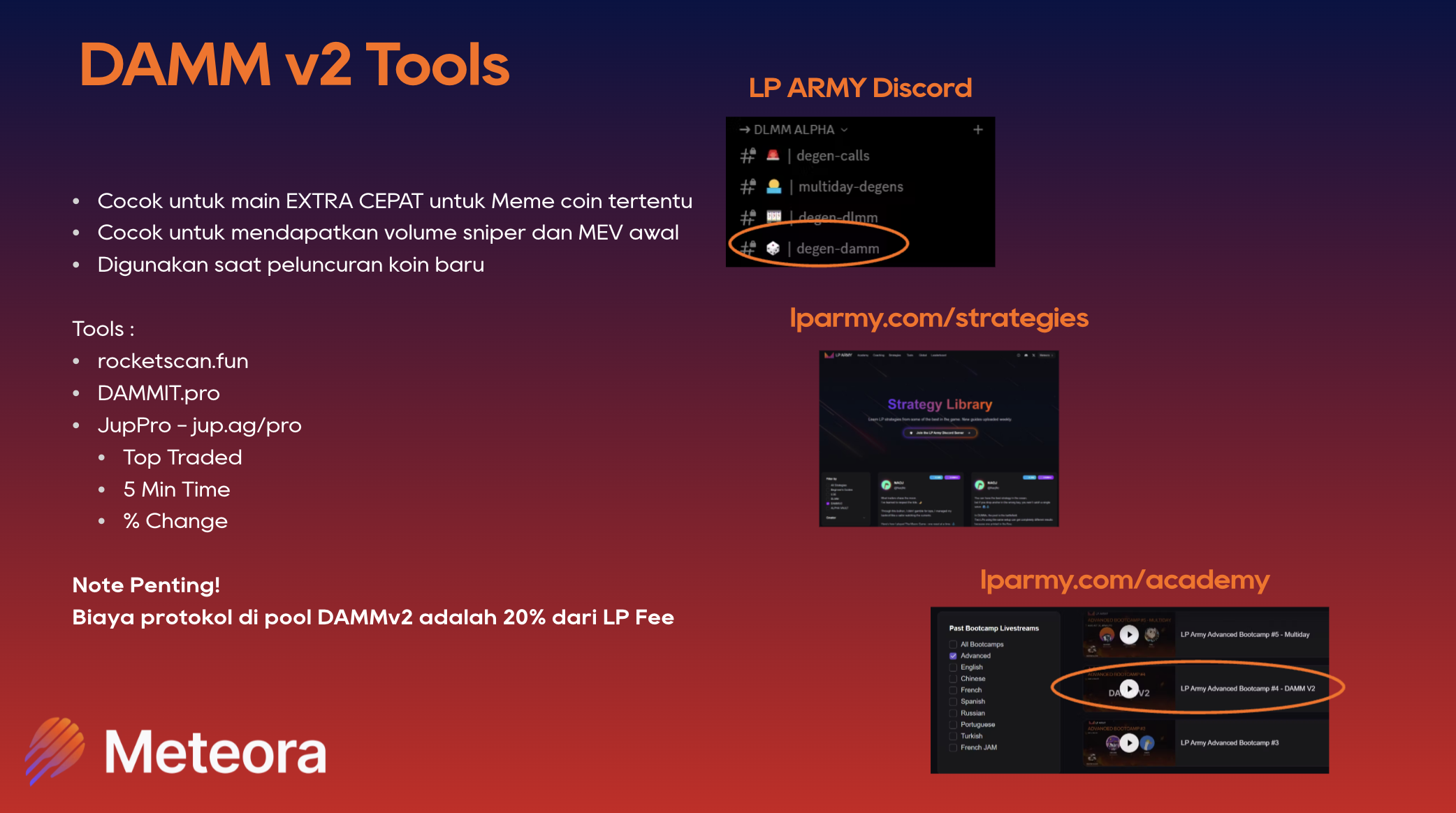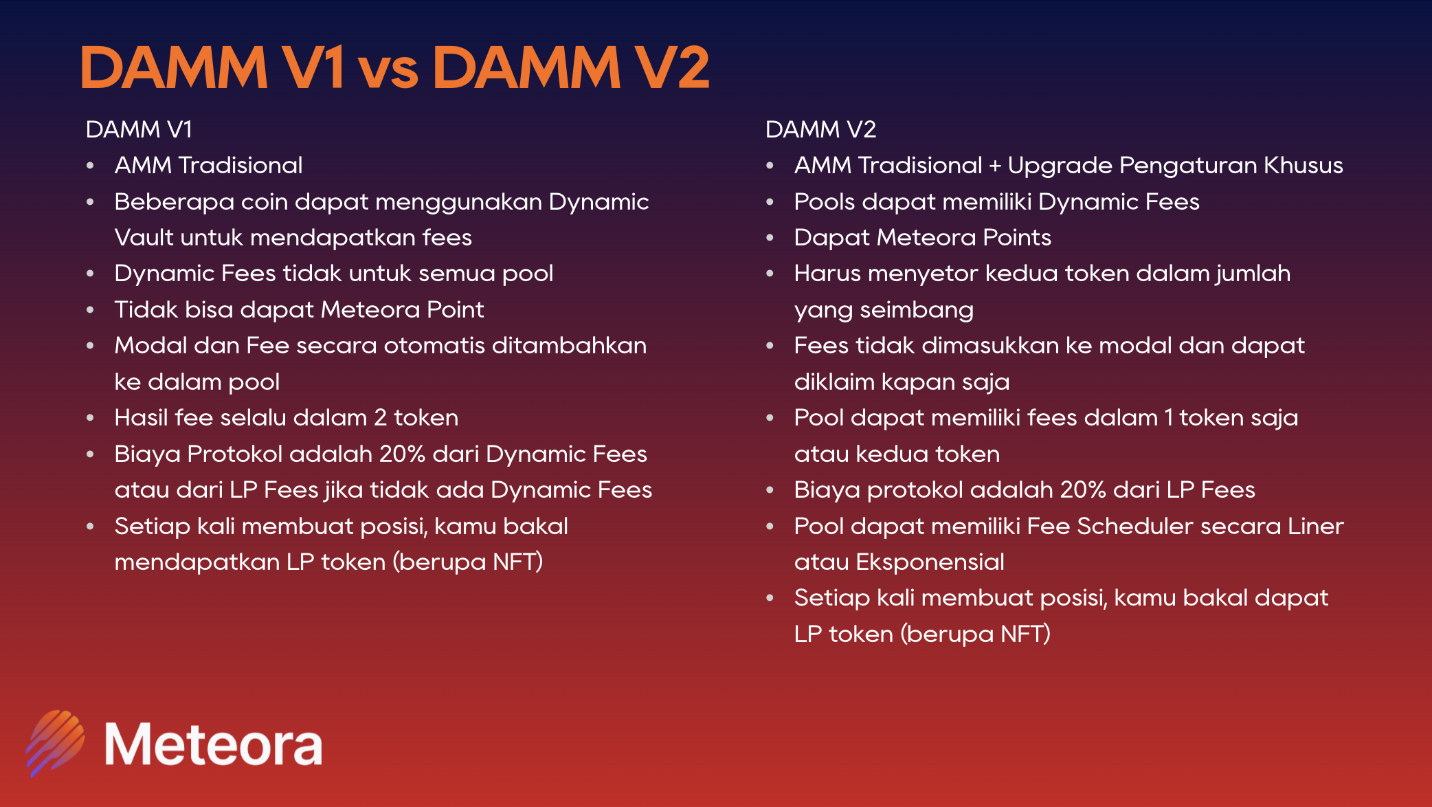 DAMM v1 identik dengan AMM tradisional, tetapi memiliki skema Dynamic Fees, dimana semakin tinggi volume akan semakin besar jg fee yang didapatkan. Fee dan yield nya akan secara otomatis di compound didalam DAMM v1. DAMM V2 merupakan versi lebih canggih dengan dynamic fees dan fee scheduler (fee bisa di sesuaikan berdasarkan waktu).