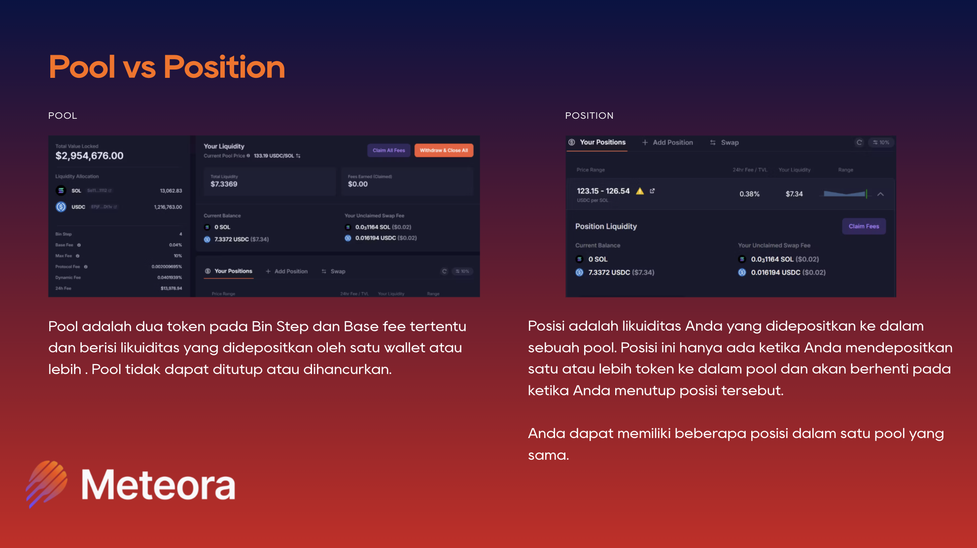 Pools dan bins dapat diisi oleh liquidity semua orang dan tidak bisa dihancurkan. Yang dimaksud 'POSISI' adalah liquidity Anda di pool tersebut. Anda bisa memiliki sebanyak apapun posisi yang Anda mau.